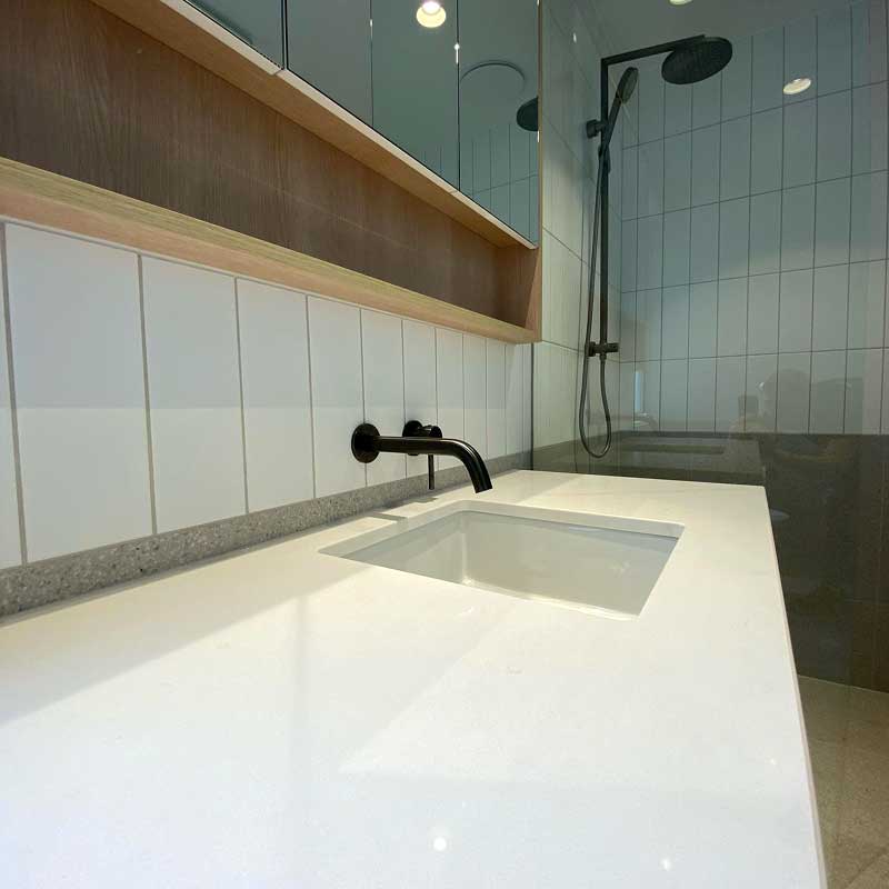 Professional waterproofing and careful tiling work were completed to ensure a long-lasting result. The marble tiles and Japanese tiles were installed with attention to detail, creating a seamless and elegant finish. Soft downlights on the ceiling add to the relaxing and modern look of the room. This completed apartment bathroom renovation shows how a small space can become both stylish and practical. If you are in Melbourne and planning a bathroom renovation, this project is a great example of how a professional builder can bring new life to your space with tiling, waterproofing and clever design choices.