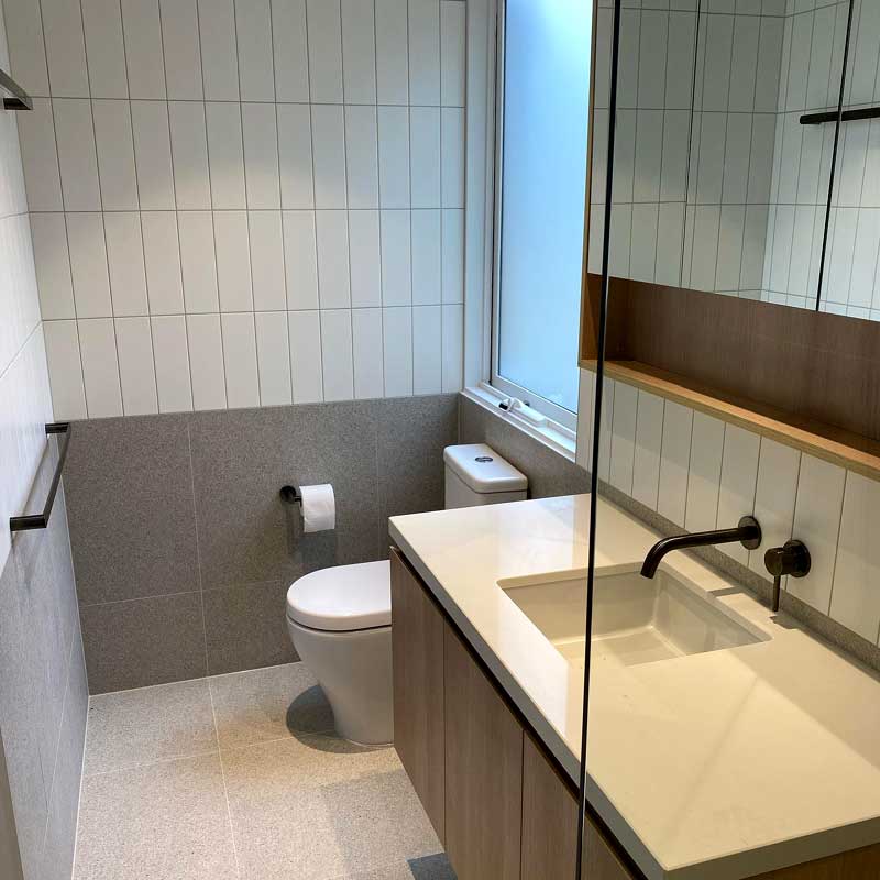 This bathroom renovation in Sandringham turned a small apartment bathroom into a modern and welcoming space. The apartment renovation was carefully planned and completed by a skilled builder who focused on creating a practical layout with a stylish finish. The Small Bathroom has a stretched design with the door in the middle, the toilet to the left and a bright shower cabin with a glass wall and door to the right. The result is a bathroom that feels open and easy to use, perfect for apartment living.